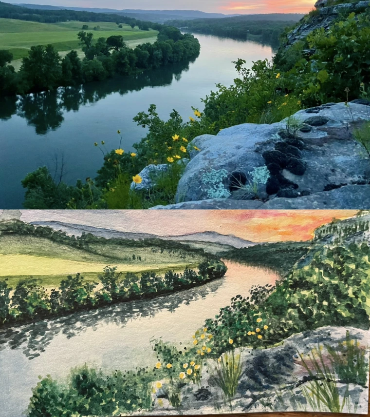 One of my daughters likes to paint, and she painted this river scene on a tiny card (2 x 3") just to see how it would come out. These are the photos stitched together on the top of the episode page. There was no other motivation other than painting it expressed her delight in the scene and completed the emotion by providing an outlet for it and making it more possible to share that emotion with others.